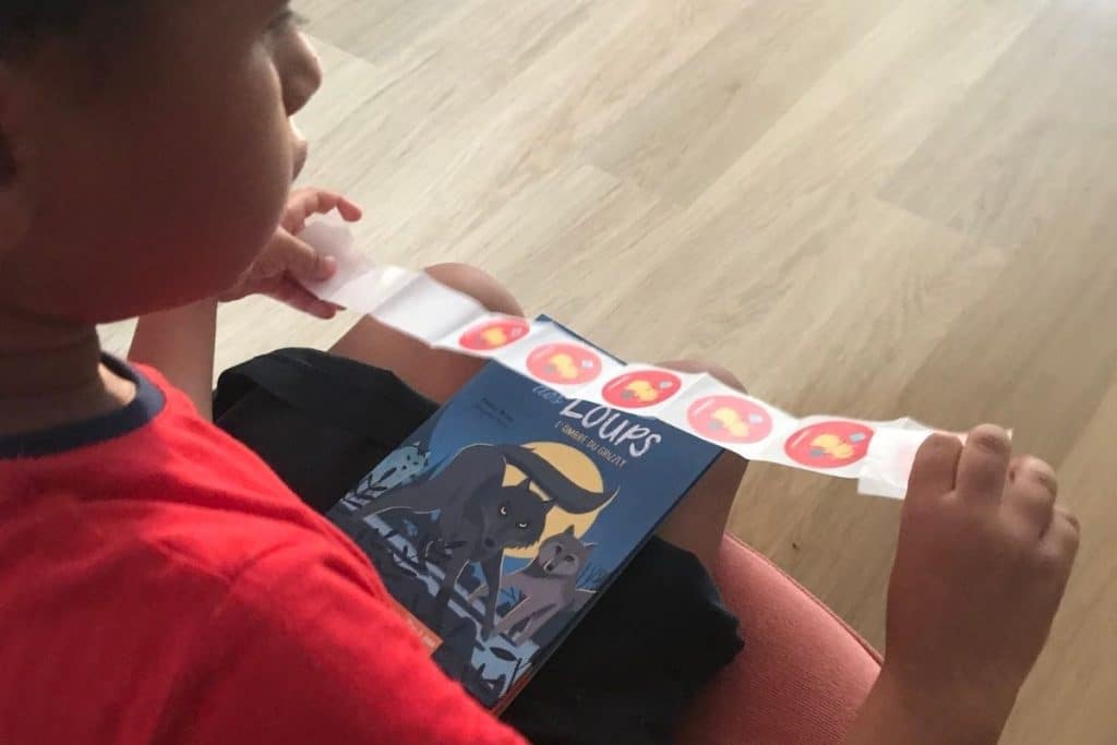 Ensuite il faut venir synchroniser le boîtier avec le livre via l’application. Pour réaliser cette opération, il suffit de coller une petite gommette et de la scanner avec le boitier Bookinou. A l’issue de cette étape, passer le livre « étiqueté » devant le boitier suffit à déclencher la lecture. Je précise que le boîtier est livré avec une douzaine de vignettes. Pour enregistrer les livres suivants, il faut vous procurer des gommettes supplémentaires. Alors que j’écris cet article, il faut compte 4,99 € pour 5 étiquettes si vous en commandez 20, soit au total