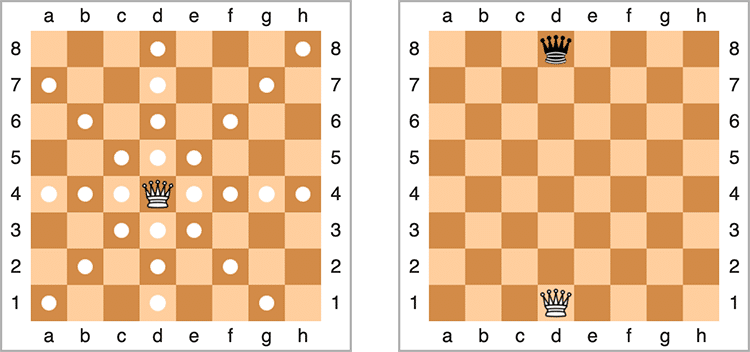 La dame, aussi appelé reine, est la pièce la plus puissante du jeu. En effet, elle peut se déplacer dans n’importe quelle direction mais toujours en ligne droite. Elle peut atteindre n’importe quelle distance tant que son chemin est clair. Elle combine ainsi les déplacements de la tour et du fou.