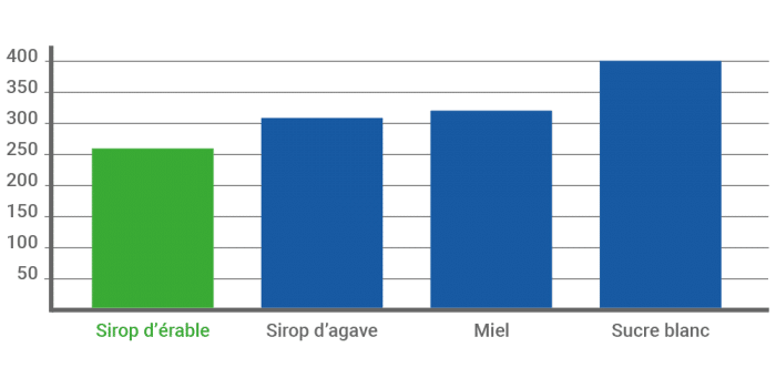 En outre, il a une forte capacité à sucrer sans avoir un pouvoir calorique trop important. Entre le miel, le sucre blanc et le sirop d’érable, c’est bien ce dernier ingrédient qu’il faut privilégier comme le montre le graphique ci-dessous.