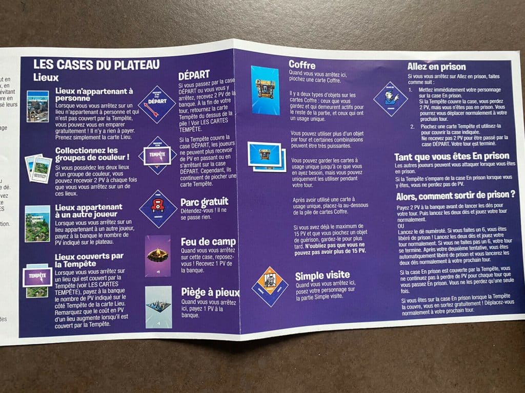 Pour aller plus loin dans l’originalité, il n’y a ni maisons ni hôtels. Les propriétés, lieux caractéristiques de l’Île Fortnite, peuvent être acquises gratuitement par le joueur qui tombe sur une de ces cases inoccupées. Elles sont matérialisées par 16 cartes Lieu. Les cartes Mur, permettant de fortifier vos propriétés, sont utilisables durant la partie en lançant un dé spécial.