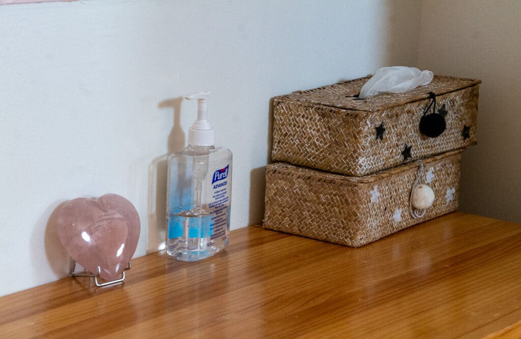 Notre espace est aménagé comme une maison avec une partie où nous recevons les familles pour les consultations et les préparations à la naissance. Elle se compose d’un salon, d’une cuisine, d’un bureau et d’une salle avec des tapis au sol. L’espace dédié à la naissance est formé d’une chambre, d’une salle de bain et d’une baignoire d’accouchement.