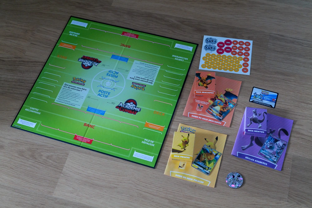 Pour apprendre à jouer, le meilleur choix sera le coffret Pokemon Académie de Combat. Il comporte 2 decks, un plateau de jeu et tous les éléments pour faire une partie en 1 contre 1. Vous pouvez voir ça comme un jeu de société : en ouvrant la boîte, vous pouvez tout de suite apprendre et jouer.
