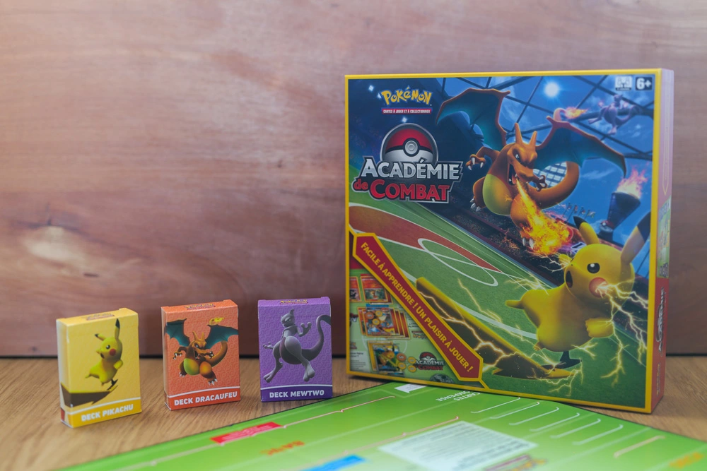 Pour apprendre à jouer, une première option consiste à acheter le coffret Pokemon Académie de Combat. Il comporte 2 decks, un plateau de jeu et tous les éléments pour faire une partie en 1 contre 1. Vous pouvez voir ça comme un jeu de société : en ouvrant la boîte, vous pouvez tout de suite apprendre et jouer.